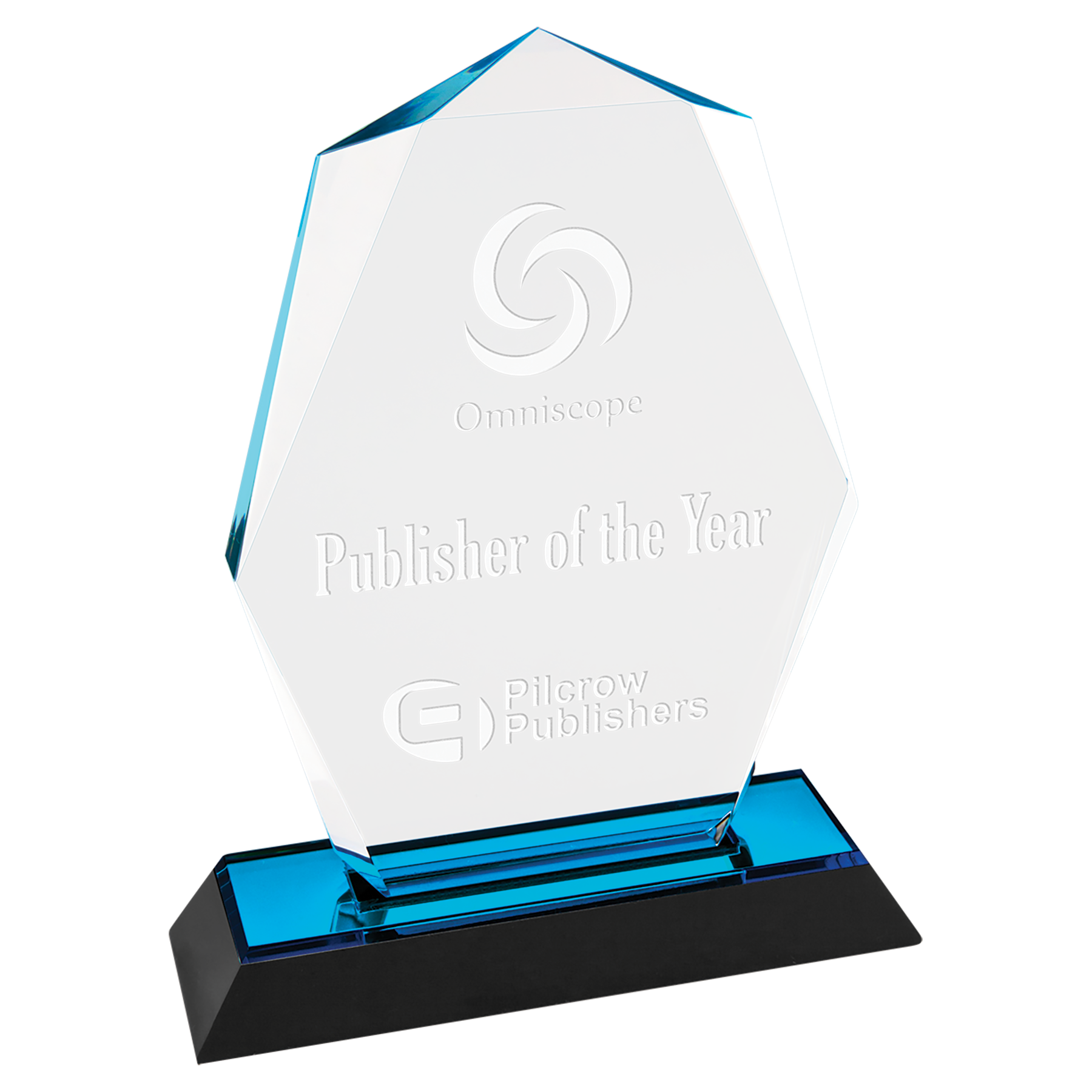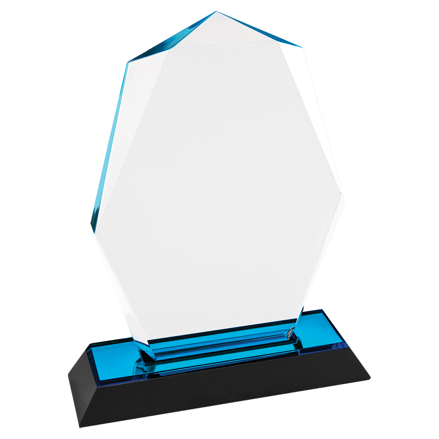 The 1/2" thick Blue Octagon Point Impress Acrylic is cut and beveled to form an octagon design. The colored mirrored top of the black acrylic base reflects upward through the clear beveled acrylic creating a simple, stunning effect. Perfect for your company's quarterly achievements, retirements, anniversaries, or any milestone that deserves recognition. Available in 3 sizes and 3 colors.