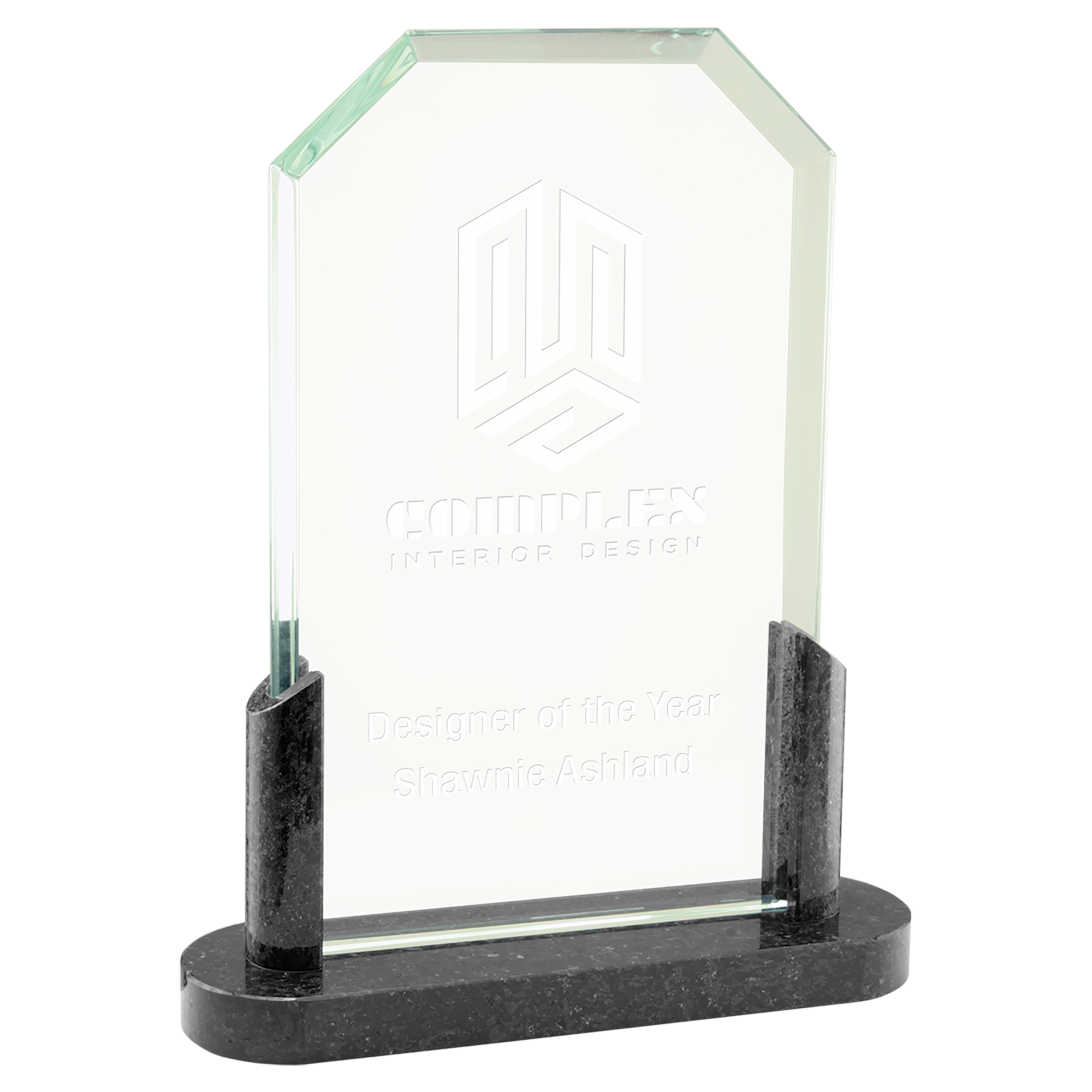 This beautiful 7 3/4" Clipped Corners Glass with Black Marble Base is an award anyone would be honored to display on their desk, shelf or mantle. Its black marble base along with its beveled edges create a rich contrast that accentuates the laser or sand engraved message of your choice!