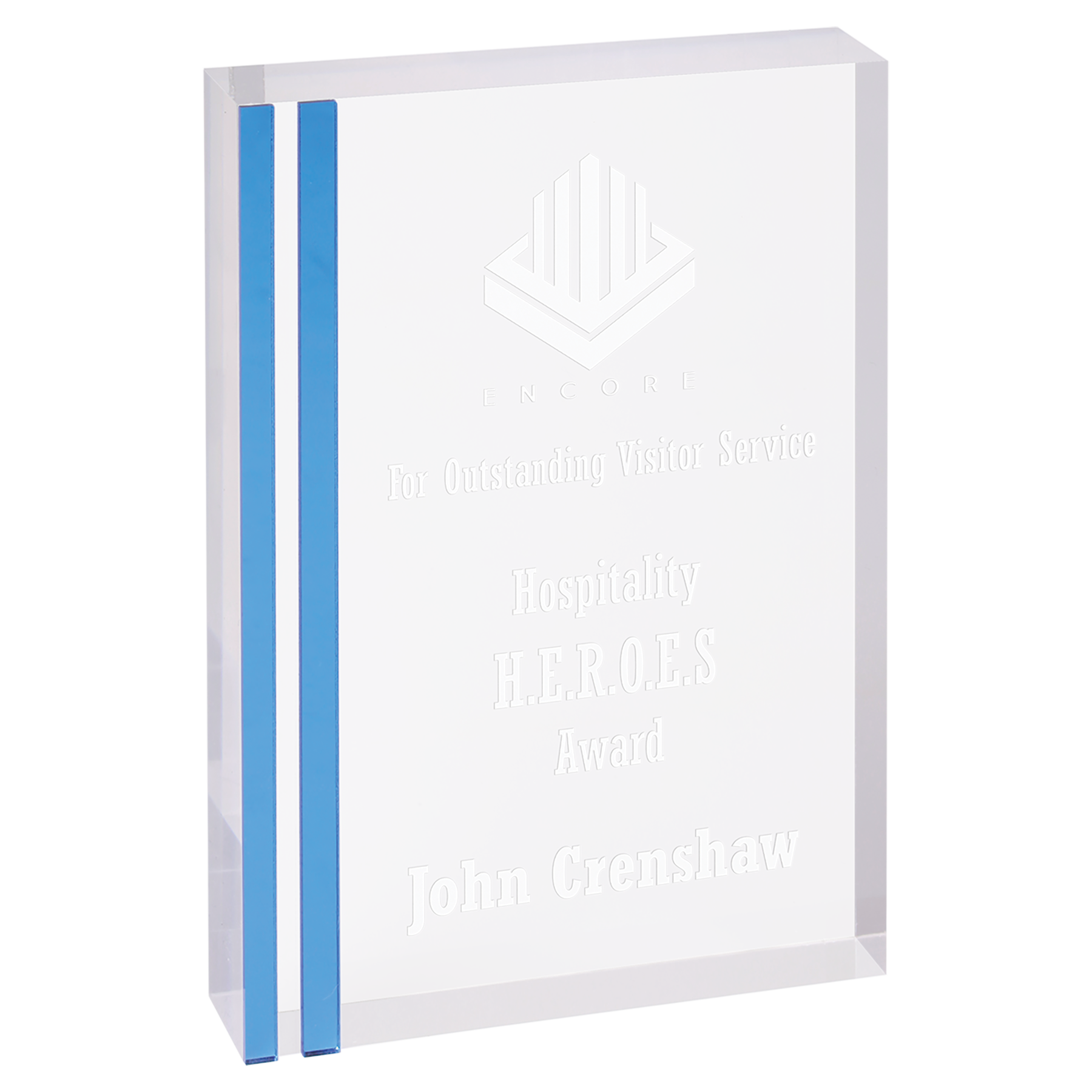 Our Color Edge Acrylics also come in a 6" by 8" rectangular if you need slightly more of a customization area. Lined with two blue, gold, or silver stripes, the Color Edge Rectangle Acrylics make for a perfect recognition award for those who have gone above and beyond your expectations. Available in 3 sizes.