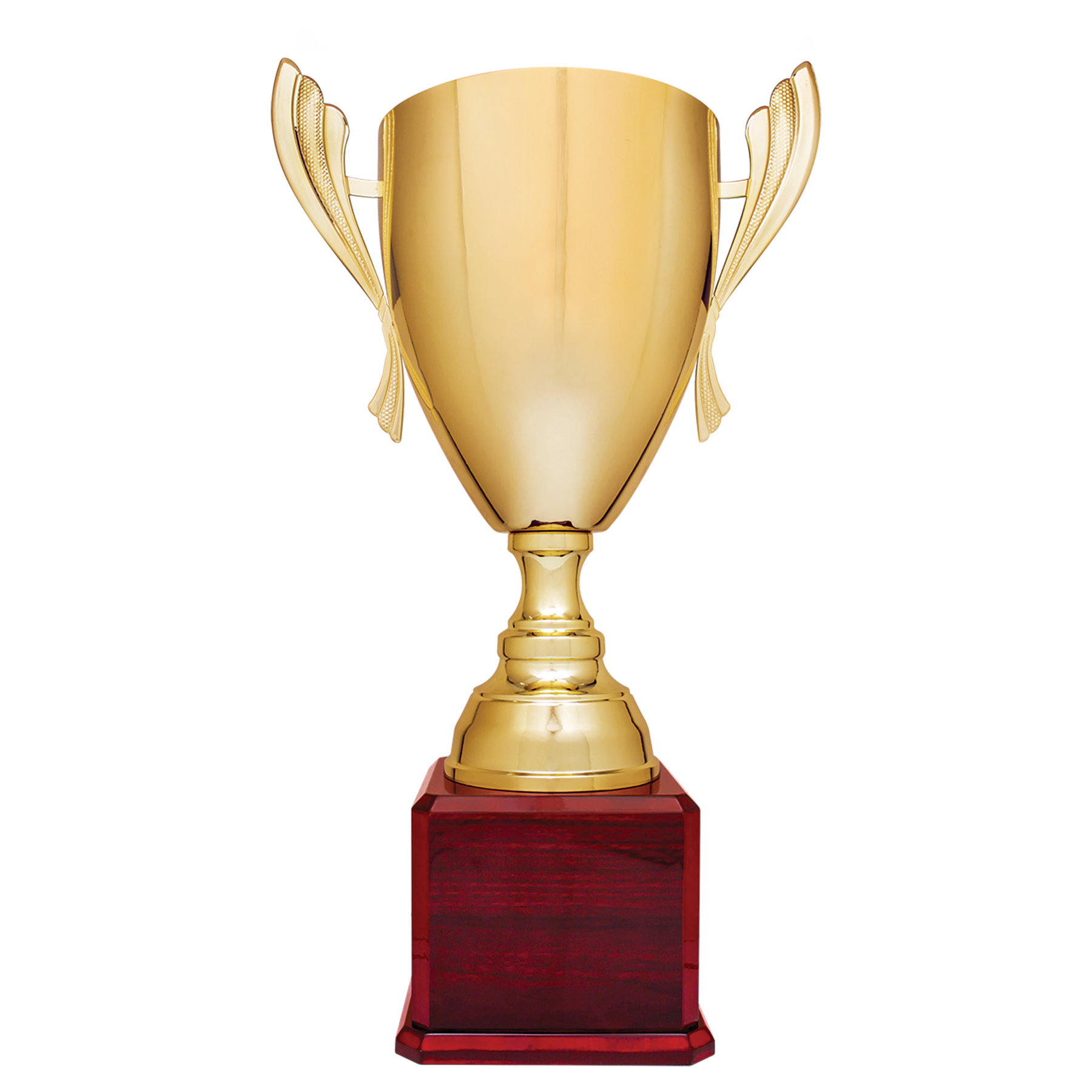 Our 26 1/2" Gold Completed Metal Cup Trophy is a traditional metal cup that is the ultimate in recognition, from athletic achievements to corporate awards. The cup has a highly polished gold finish with ornate handles and is mounted to a rosewood piano finish base that has plenty of room to personalize.