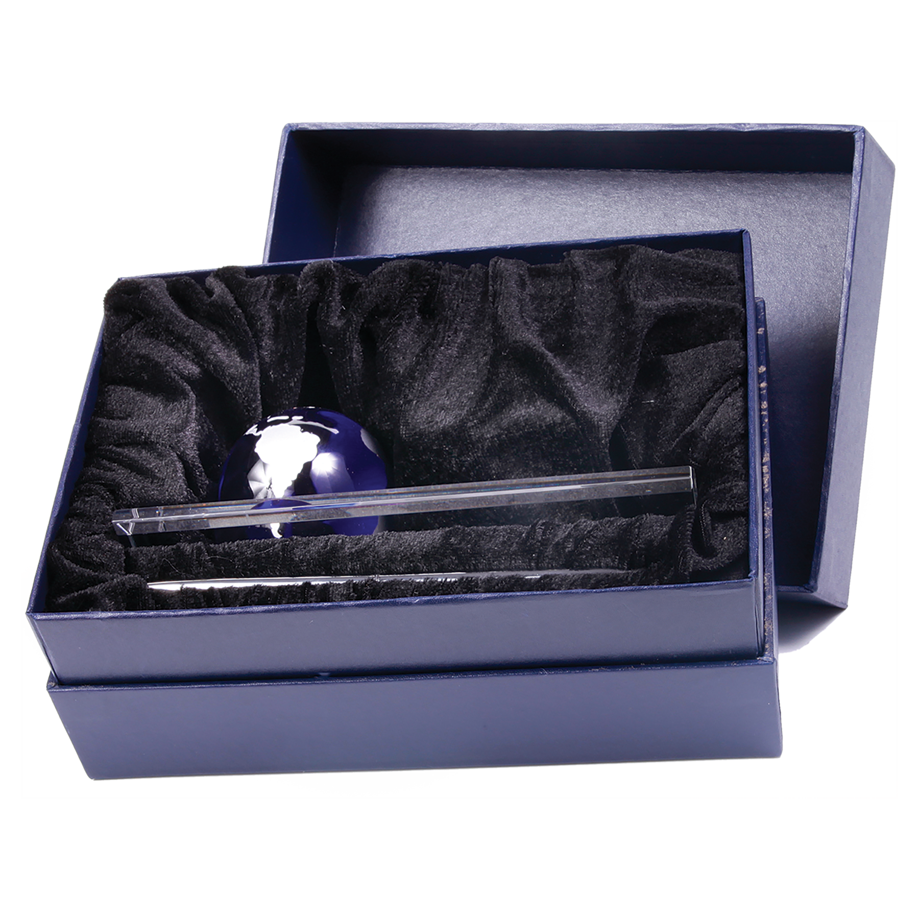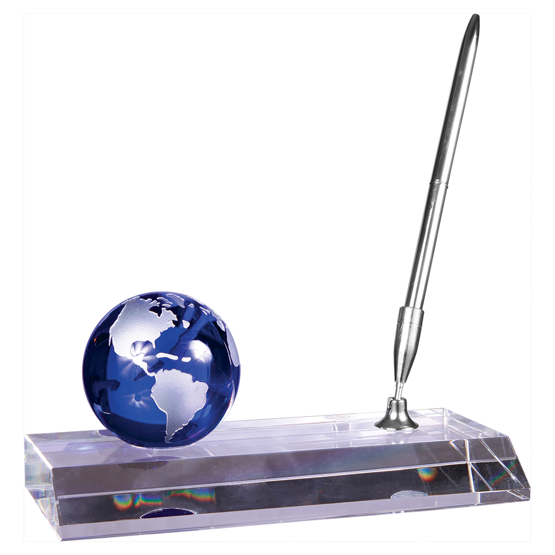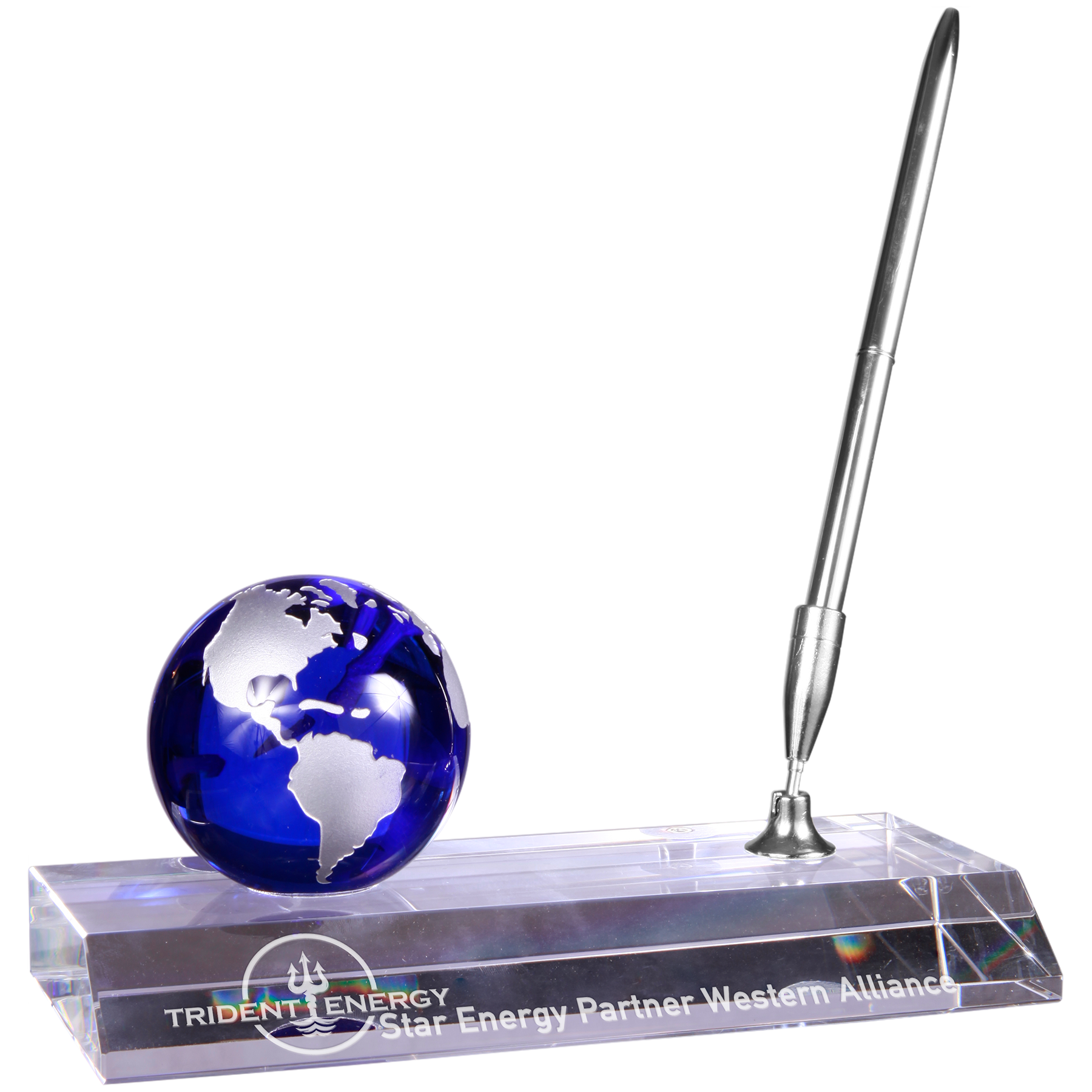 This 7" long by 3" wide and 3" tall award features a blue globe resting on a clear base that can be personalized for your event or special occasion; ideal for your corporate employees to keep at their desks to display their accomplishments. The globe and pen provide an exquisite professional look that will also promote the work of your company.