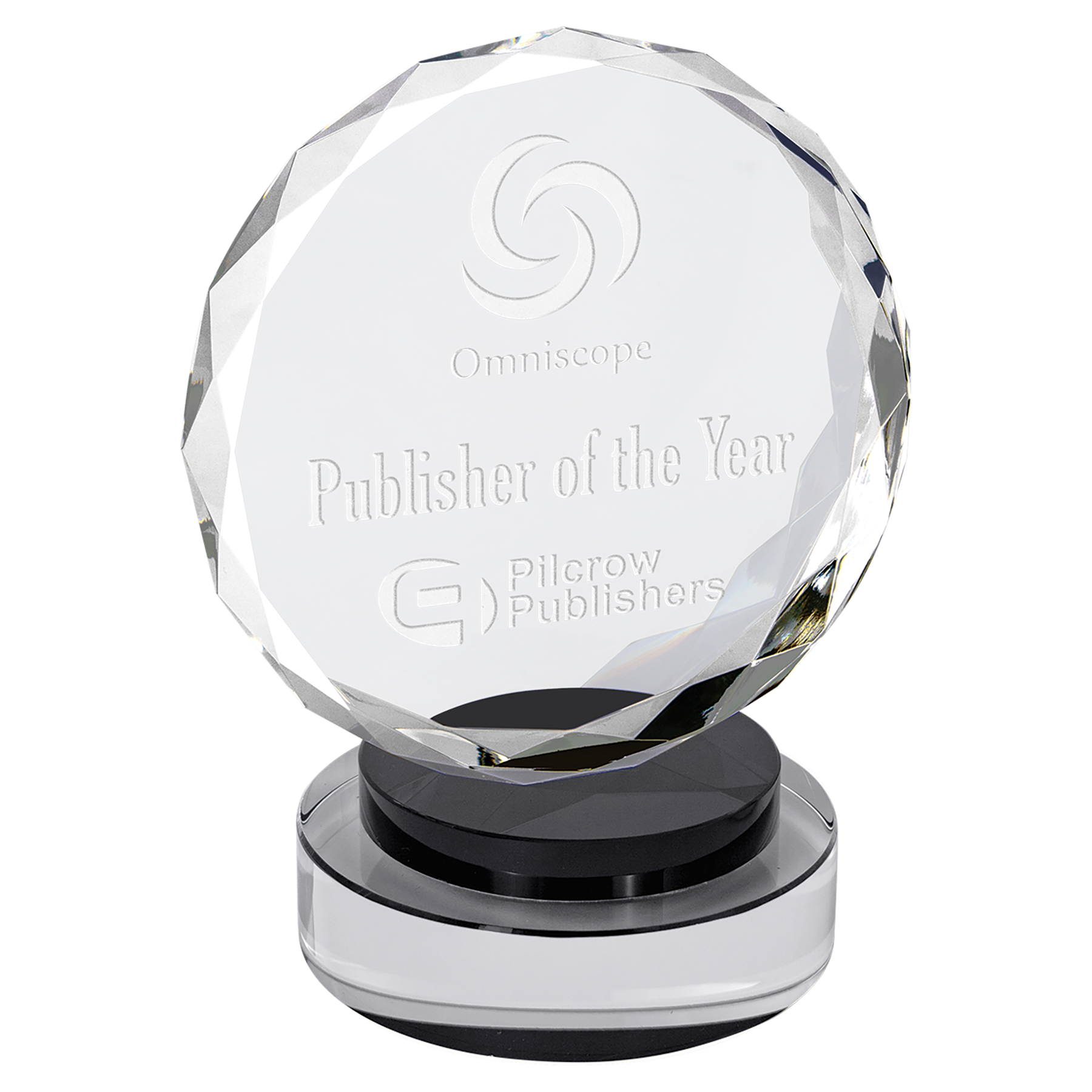 Present a simple, yet fascinating 6" round crystal award at this year's ceremony. Each award is beautifully handcrafted and sits on a black pedestal base. Engraving shows up a lovely frosted color. Your award arrives individually packaged. Available in 3 sizes and 2 colors.