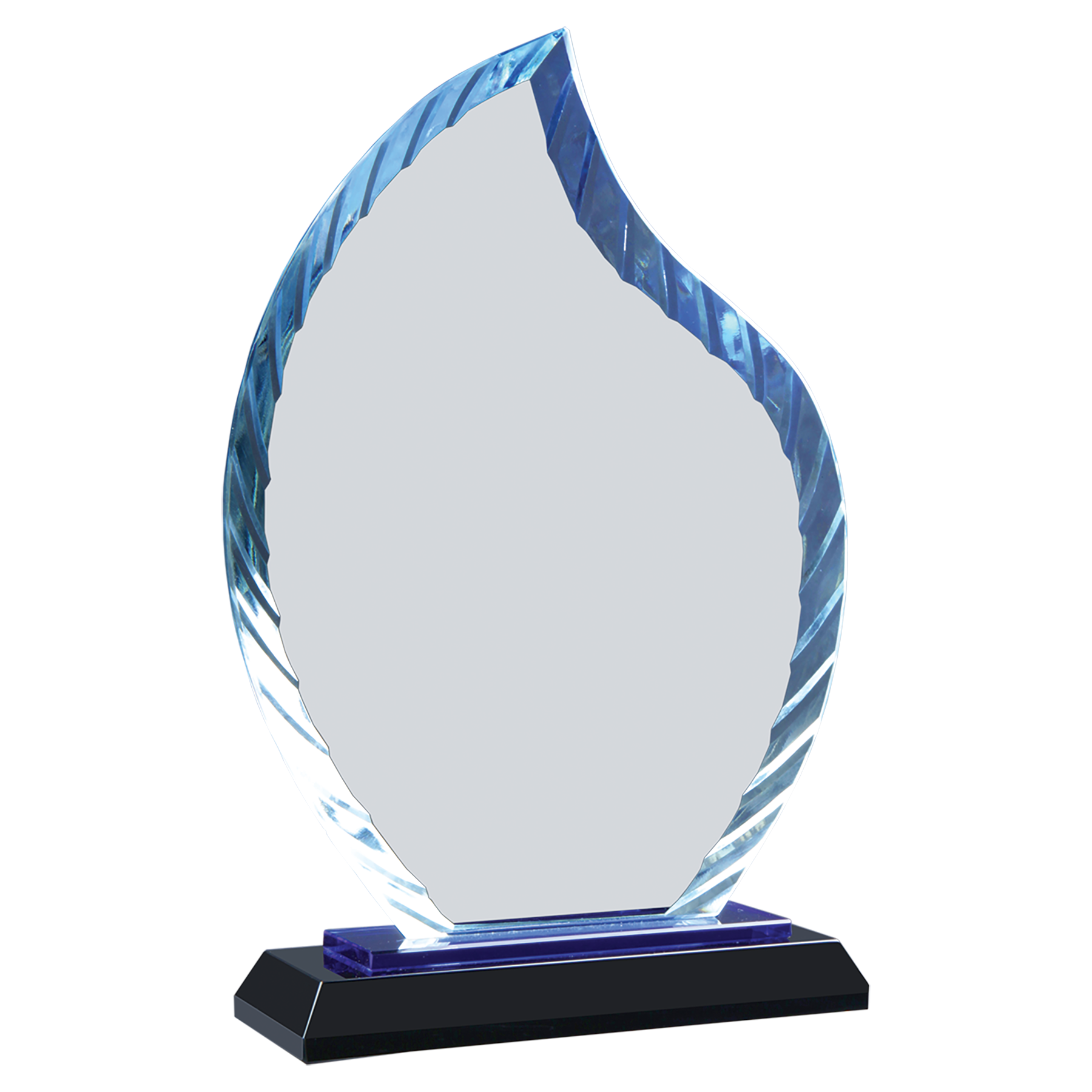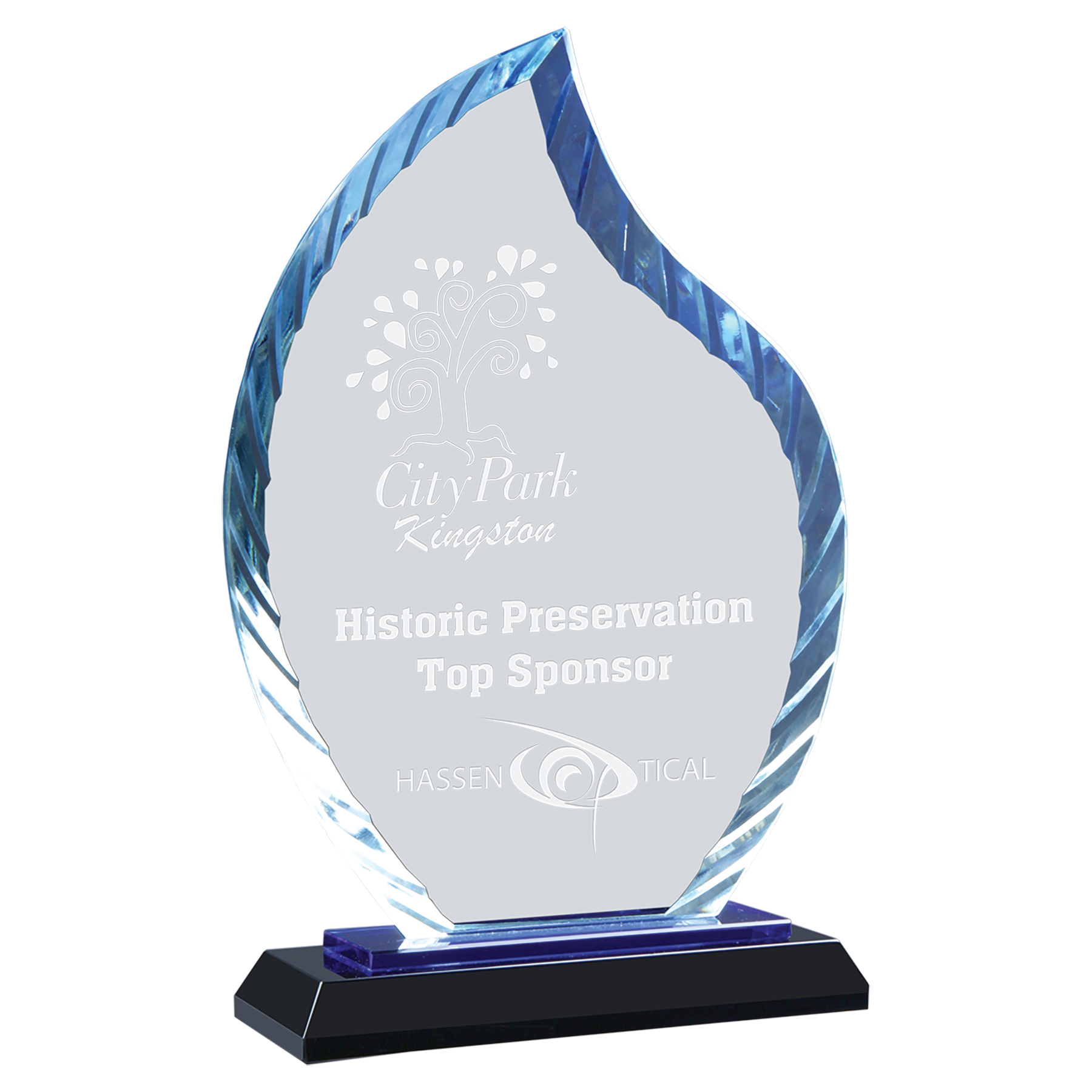 This 8" Flame Accent Glass is a beautiful, simple, yet elegant award. It's made of blue glass, which is a nice twist from your typical clear awards, and features an accent border. The award can be laser or sand engraved for clean, crisp finish that compliments your words of recognition for an outstanding individual.